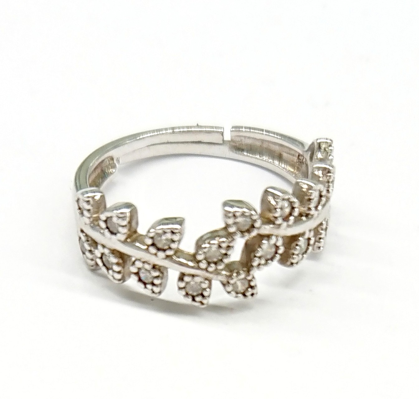 Anello Trova Gioielli con foglie in argento 925 e zirconi bianchi misura regolabile.